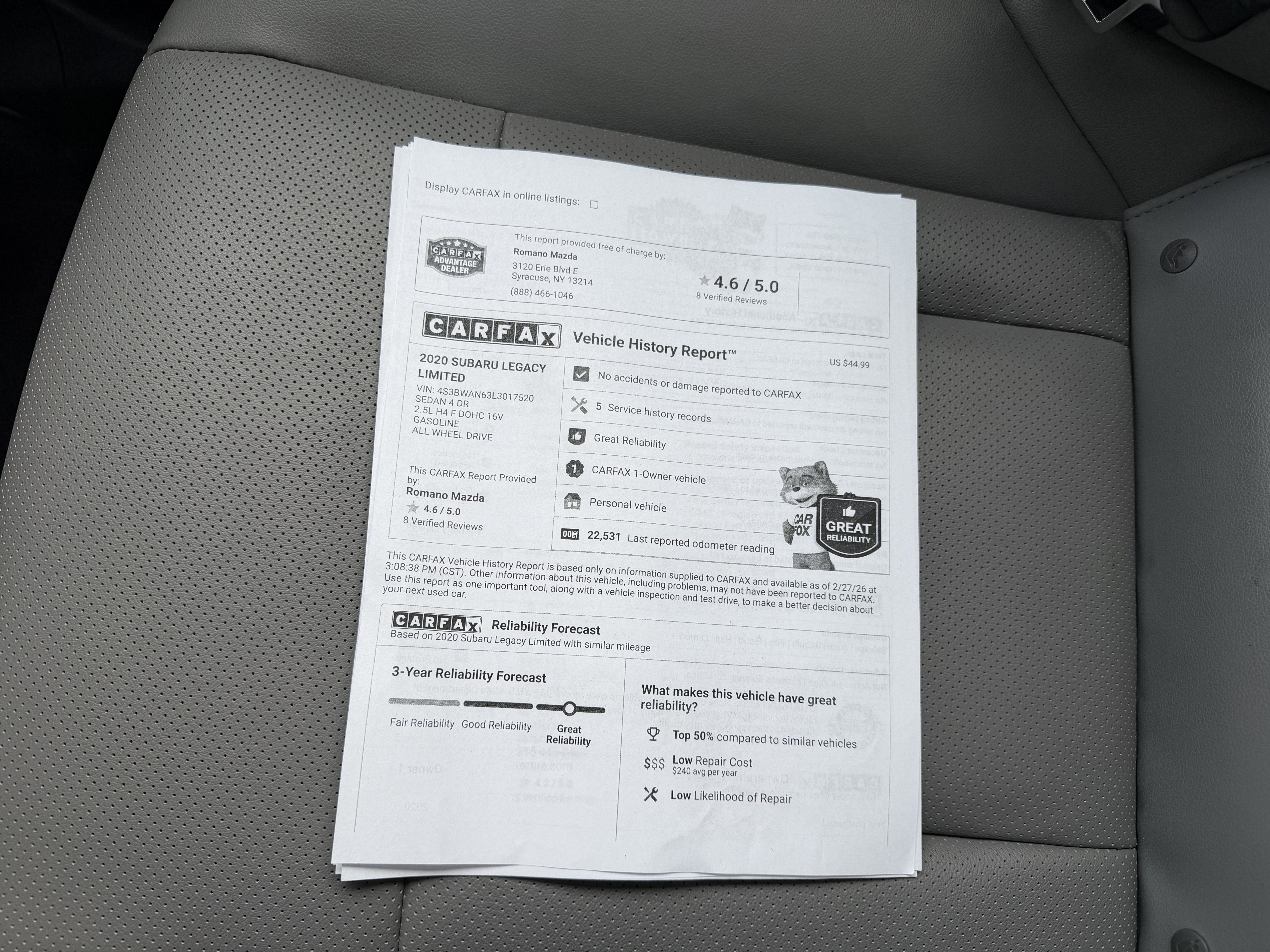 All pre-owned vehicles at Romano Mazda come with an CARFAX Vehicle History Report in the glove box, and a repair order that indicates all service repairs that have been performed by ASCE Certified technicians on the vehicle. All of our pre-owned vehicles are gassed and ready for test drive. All of our pre-owned vehicles undergo a rigorous 160-point inspection to help you save time and money. All trades are welcome. You mean business and so do we!